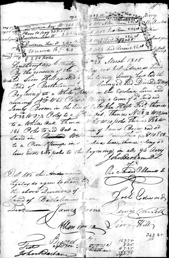 After 1762, Sion Hill, with or without wife Sarah, is not found in Southampton County, VA. However, in that same year 1762, Jesse Williamson of Southampton County, VA sells land to Sion Hill of Northampton County, NC. If we follow that land and several other deeds, we find that wife Sarah is with Sion Hill in Northampton County, NC. Sion Hill purchases additional land from Hardy Fennell of Brunswick County in 1766 and the land is in Northampton County, NC on the east side of Kates Hole. In 1766, Sion Hill of Northampton County, sells some of his land to Thomas Peters of Sussex County, VA. The details of the land transaction are clear and laid out in detail. Sarah was privately examined and relinquished her right of dower in the land.