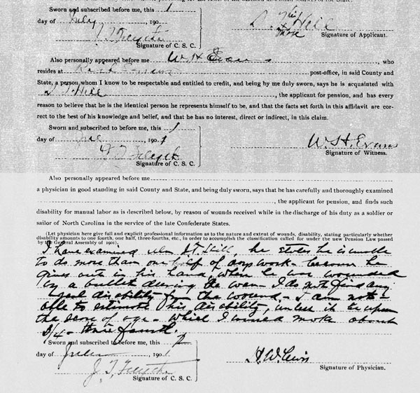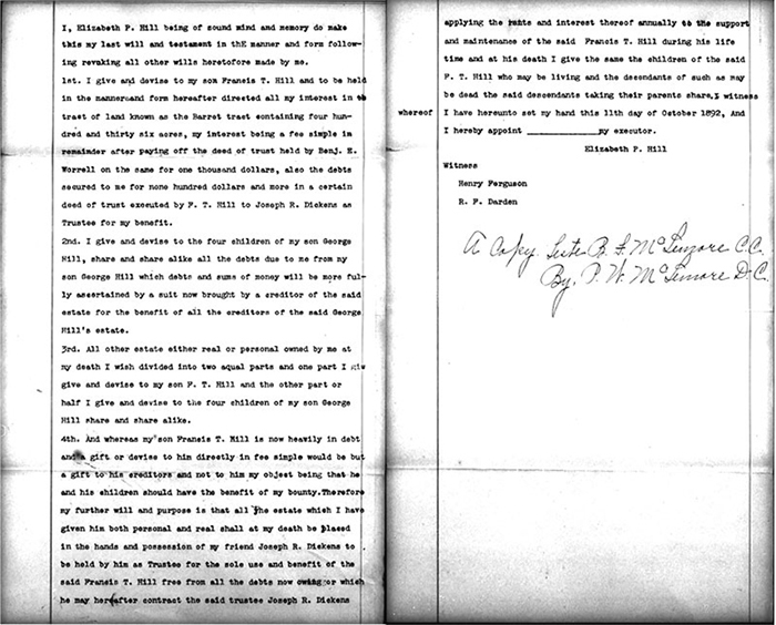 Elizabeth P. Hill gave her deposition on 5 July 1899. She gave her age as 68. She stated Frank, her son, was the one she looked to. She did not intend to grant them a right of way over the Home tract and nothing was said to her about it. She did not read the deed she signed because they were in a hurry for me to sign. Frank brought the papers in and said there is no used to say anything about it as Jim Knight as done signed and I put my name to the paper. I didn't know there was a phrase regarding the use of the home tract and I should not have signed it. They asked is she could read well and she said "No sire, very little I can read. When she signed it she intended to grant only travel through the George Hill tract.