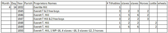 The 1820 census showed William Hill with seven slaves. The LW&T named six Negro slaves to be distributed. We note that William wanted the slaves to be set free and we remember that the personal property tax showed he kept several free Negros and paid their tithable. He felt so strongly about their freedom that he allowed for them to be sent to a state that did recognize free Negros.