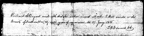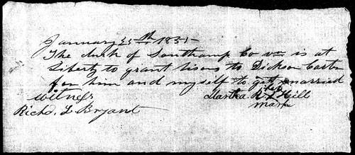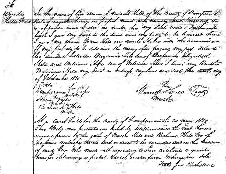At a court held for the County of Southampton on the 17th October 1825 this Will was presented in Court by Mason Hill the executrix therein named, proved by the oath of John Barrett and Jacob Barrett two of the witnesses thereto and ordered to be recorded and on the motion of said Executor who made oath according to law, certificate is granted him [her] for obtaining a probate thereof in due form of her giving Bond and security whereupon the said Mason Hill together with Exum Everitt and John Barrett her said securities entered into and acknowledged their bond in the penalty of three thousand dollars conditioned as the law directs. Test James Rochelle CC