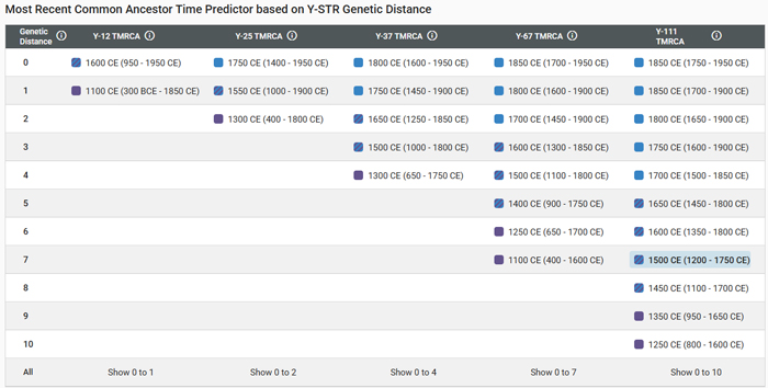 Looking at the chart, if you were 2 genetic markers difference from someone on the 111-marker test, then look across to the last column and you would find that your common ancestor could be as early as 1800-1900. If you were 5 genetic markers difference from someone on the 111-marker test, then look at the last column and you would see that your common ancestor would be between 1650-1800. That works even for my most distanct situation discussed below.