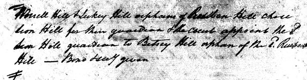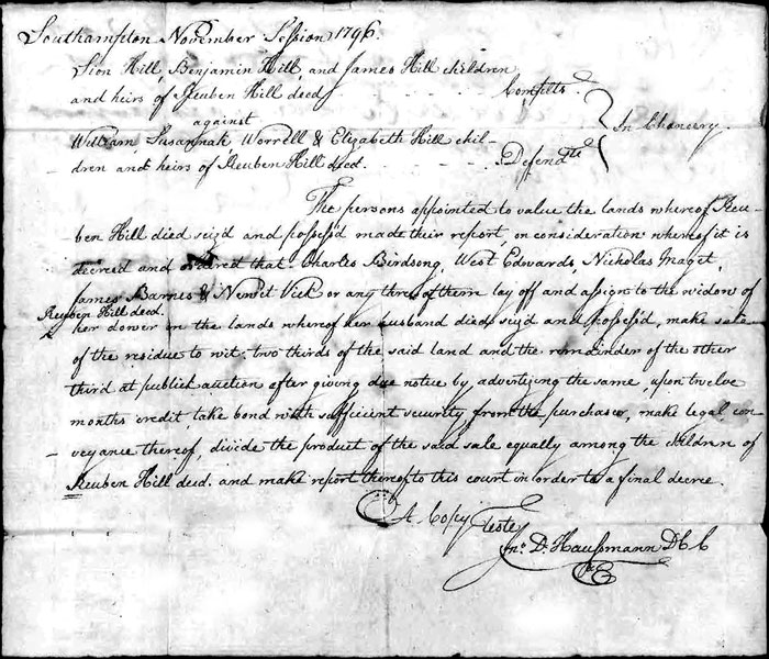 We've noted that William Hill was an "infant" in the Chancery Court documents in November 1795 when the land of his father Reuben Hill was sold. He was still not age 21 in the November Session of 1796 when the courts ordered the advertising of the land to be sold. It's possible that the November 1795 document was out of place in the files as this one clearly shows the court session of 1796. We'll include this document because of it's importance in determining ages.