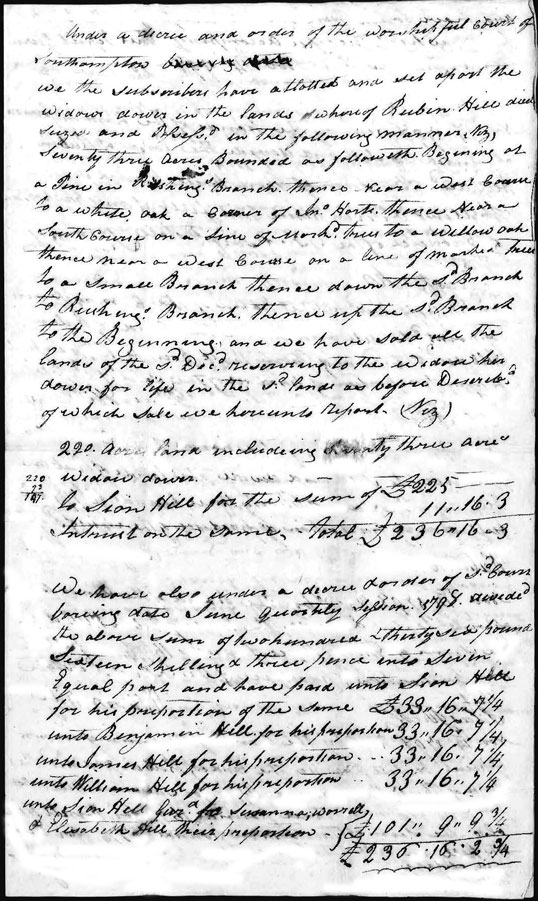 There's no question that in November 1796, William Hill was not yet age 21. That means he was born after November 1775. However, by the June quarterly session of 1798, William Hill was allotted his proportion of 33 pounds, 16 shillings and 7 1/4 pence directly to him because he was now 21 years old. Sion Hill received the three allotments for Susanna, Worrell, and Elizabeth who were not yet 21 years old. We'll show this document here as well. It's important because it shows the widow's dower laid out, the value of the land with interest and the fact it was sold to Sion Hill. A complete transcription follows with line breaks matching the document.