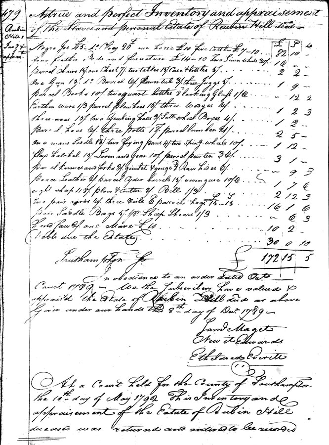There is an inventory and appraisement of William Hill's estate. It is shown below.