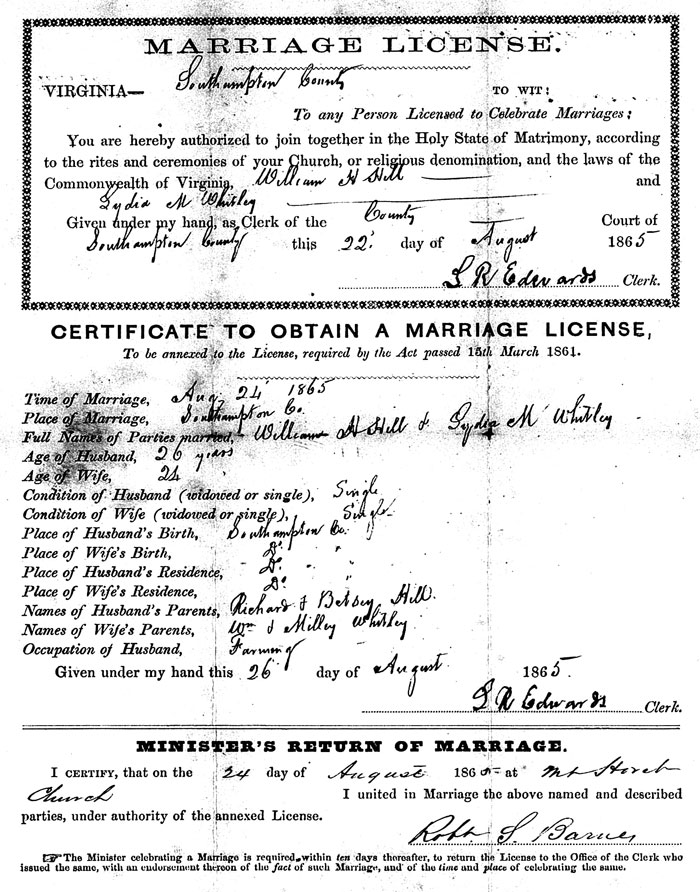 In the name of God amen, I William Hill of the Cunty of Southampton and State of Virginia being sick and weak in body but of sound mind and disposing memory for which I thank God and call to mind the uncertainty of human life and being desirous to dispose of all such worldly estate as it hath pleased God to bless me with.
