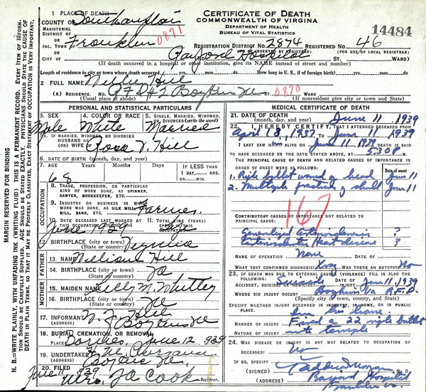 Widow Mason Hill never remarried and so the lands did not get divided to the three sons at a remarriage. One can see that the son Everett Hill was surely named about Mason's maiden name Everett. He also called one son William Hill, Jr. Later, we'll see that he carried a middle initial "L" and so we don't know whether William Hill, Senior also carried that middle name. This William Hill, Jr. is the same person named in Worrell Hill's LW&T as William Hill, son of William Hill. One son is called Harry but in most places he was Henry H. Hill. Harry is common nickname for Henry so we don't know whether he was Henry Harry Hill or whether his middle initial "H" stood for something else. We'll study him shortly.
