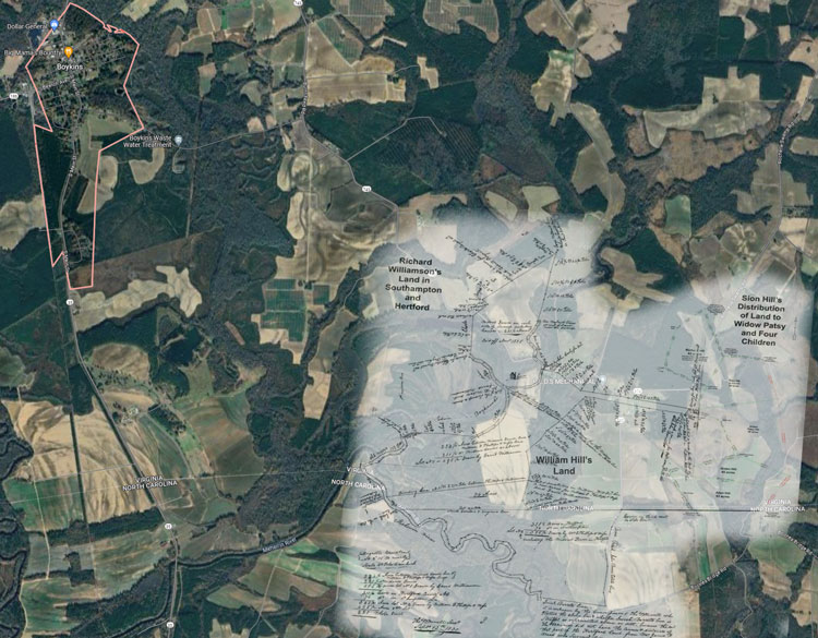 So, without a big “to do” about this deed, it is clear that Sion Hill and wife Sarah are in Southampton County selling land in 1760. The land is on Flat Swamp which is just across the state border line of North Carolina as shown in the above maps. This Sion Hill has been shown in other research to have been born around 1717.