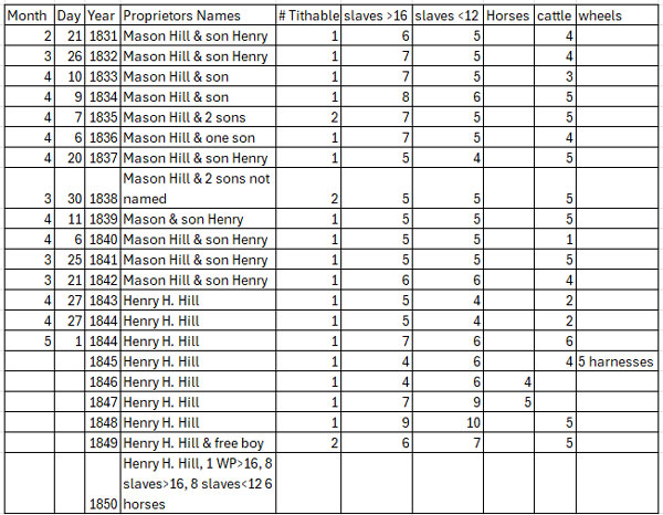 The 1820 census showed William Hill with seven slaves. The LW&T named six Negro slaves to be distributed. We note that William wanted the slaves to be set free and we remember that the personal property tax showed he kept several free Negros and paid their tithable. He felt so strongly about their freedom that he allowed for them to be sent to a state that did recognize free Negros.