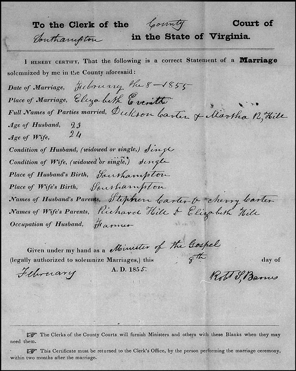 Mason Everett was born to Exum Everett and Elizabeth Barns. Exum Everett had a LW&T but we'll not transcribe it here. [Will Book 10, Inventories and Accounts, 1826-1832, Southampton, pages 231-233] It's a lengthy LW&T and there's one line for his daughter as follows: "7th - I give to my daughter Mason Hill one negro girl named Margaret to her and her heirs forever." This LW&T is also important and we'll come back to it because Elizabeth had a sister Thomas Everett who played a large role in this family. Also, we'll note here that Exum Everett's wife was named Elizabeth and the records we'll show later proves that she was born a sister to Jacob Barnes, son of an older Jacob Barnes who died about 1795 with a wife also named Elizabeth. More on this later.