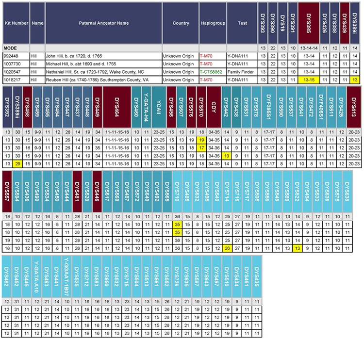 The mutations from the MODE are shown in a yellow highlight. John Hil and Michael Hill are only two genetic markers off from the MODE and they're in the same STRs; that is DYS570 and DYS710. Look at the first two rows. Now, Nathaniel Hill is only one genetic distance from the MODE and that occurs in the second group at marker DYS439 and the number 13 is one off from the MODE 14.